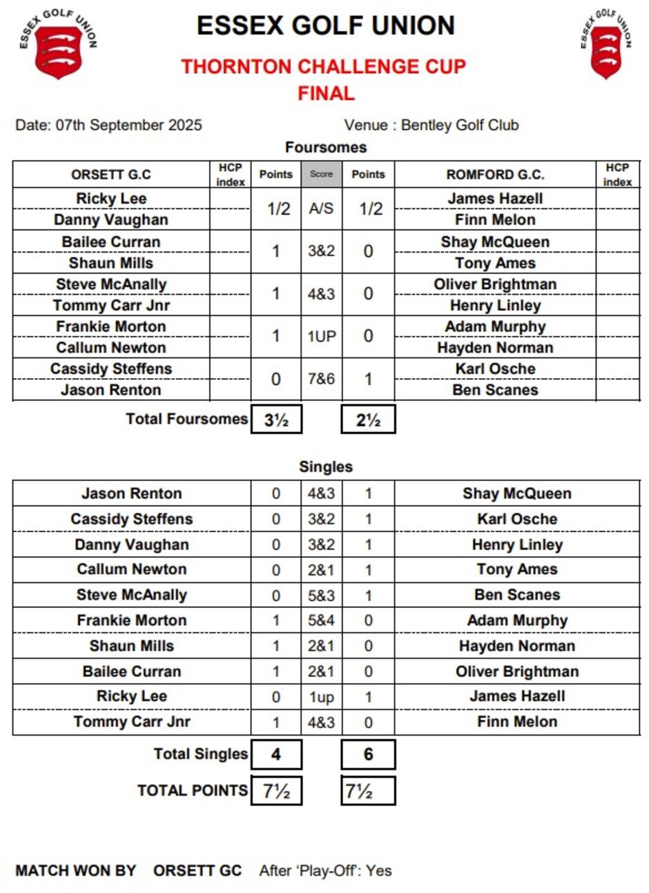 Romford GC came out strong in the morning Foursomes, winning all but 1 match, this put them in the early lead 3½ to 1½, going into the afternoon singles matches with what was a clear advantage on the defending champions Orsett, will they go on to win the Thorton Challenge Cup 2024? There was an eager and somewhat anxious wait to see how the afternoon matches would unfold.After lunch there were some heavy showers, and the temperature dropped slightly from the morning. The pendulum swung in Orsett's favour, and they had 4 points after the first 6 singles matches. Romford managed good wins from Edward Linley and Henry Linley. However, with clear wins by Jamie Benton, Zach Chegwidden, Ryan Pitcher, Bailee Curran and Shaun Mills Orsett won the singles 6½ - 3½ and went on to retain the Thornton Challenge Cup with a final result of 8 - 7 well done to them for retaining the for another year!